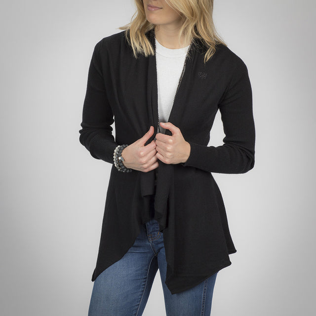 Warm, flattering, and extremely versatile. It’s designed with a shawl collar and tapered to a longer back hem for perfect pairing with any outfit. A black tone-on-tone Cambria dragon is embroidered on the left chest. 40% nylon, 30% cotton, 30% rayon. Available in classic black.