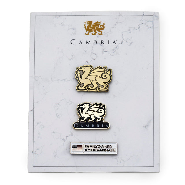 This set of custom enamel pins add Cambria flare to any outfit. The pins come in a set of three designs featuring the Cambria logo, solo dragon, and Family Owned, American Made crest. Each pin comes with a magnet clasp for secure closure without damaging delicate apparel.