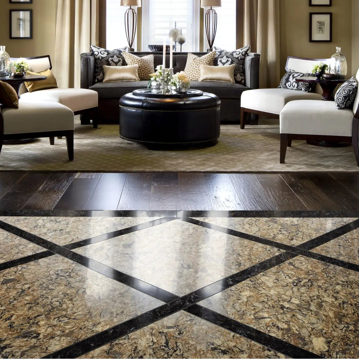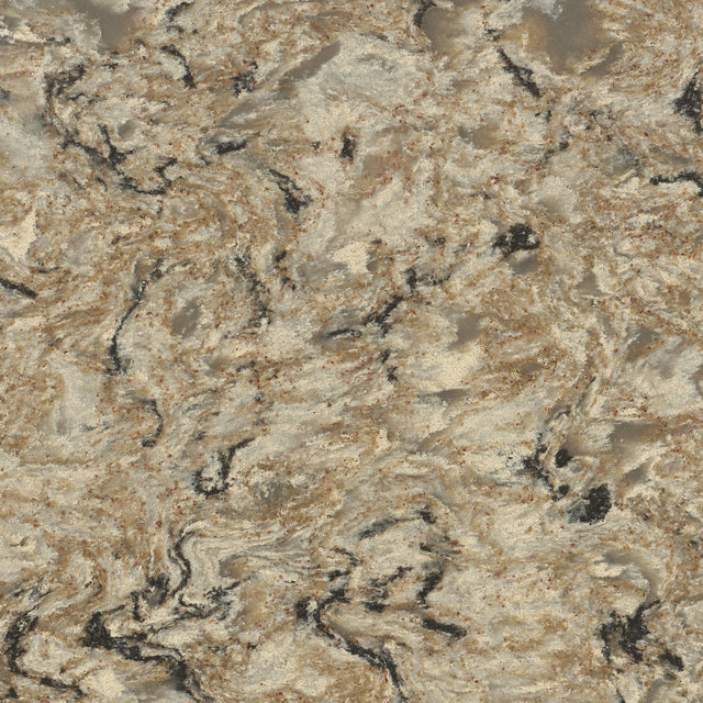 Earthy and rich, this design is a swirling blend of taupe and tans, woven with deep blacks for a natural, yet contemporary look. Stunning copper specks capture light to add a sense of charm.