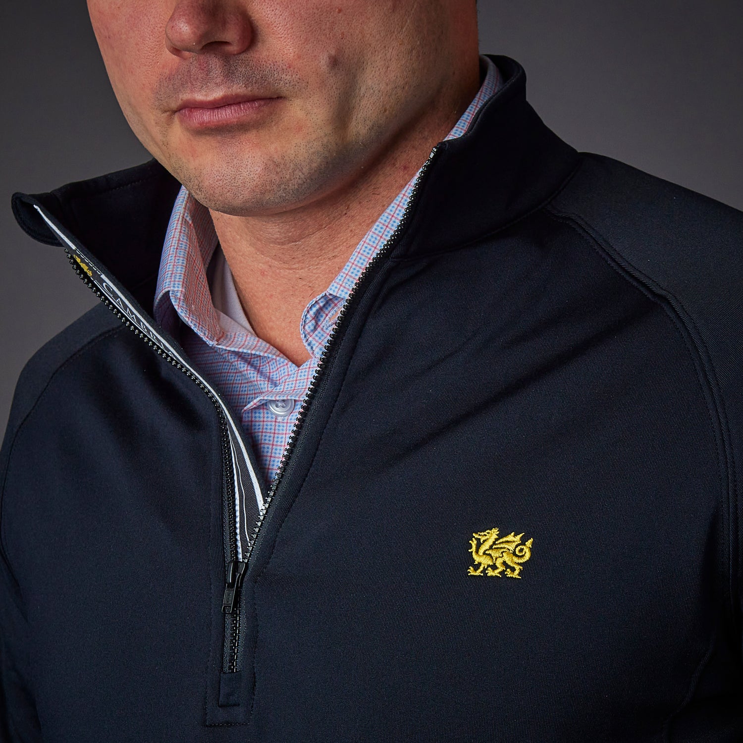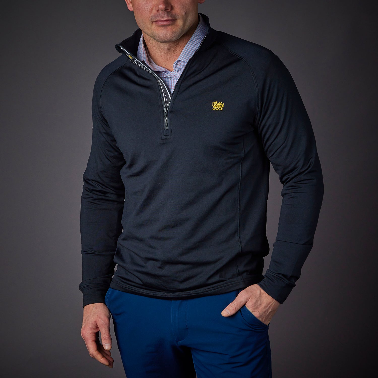 Pull on comfort and pull off a great look with this mid-weight stretch 1/4-zip pullover with raglan sleeves and underarm gussets. A gold Cambria dragon is embroidered on the left chest. Cambria logo screen printed on placket. 88% polyester, 12% spandex. Available in classic black. Uniform Approved