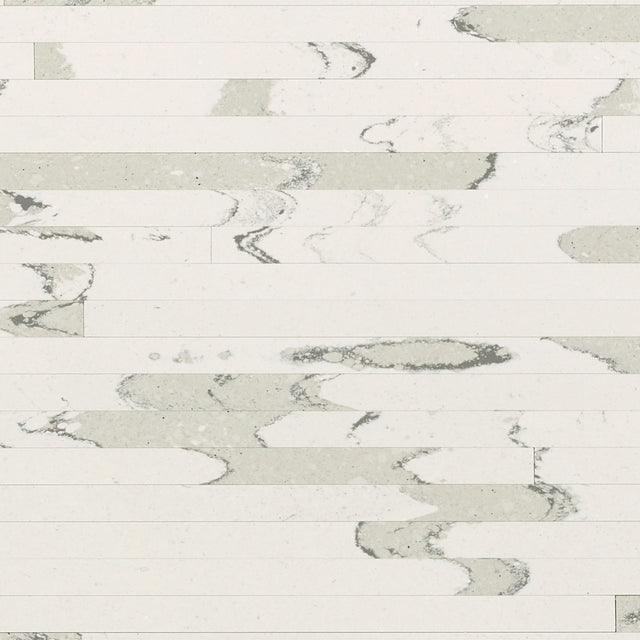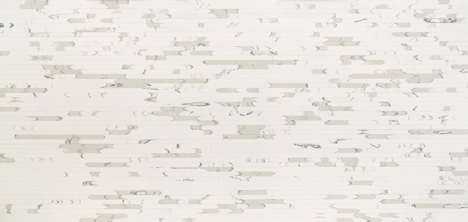 Brittanicca Block features Brittanicca™, one of Cambria’s signature designs, laid in parallel lanes with unique veining, patterns, and tonality set against a milky white background.