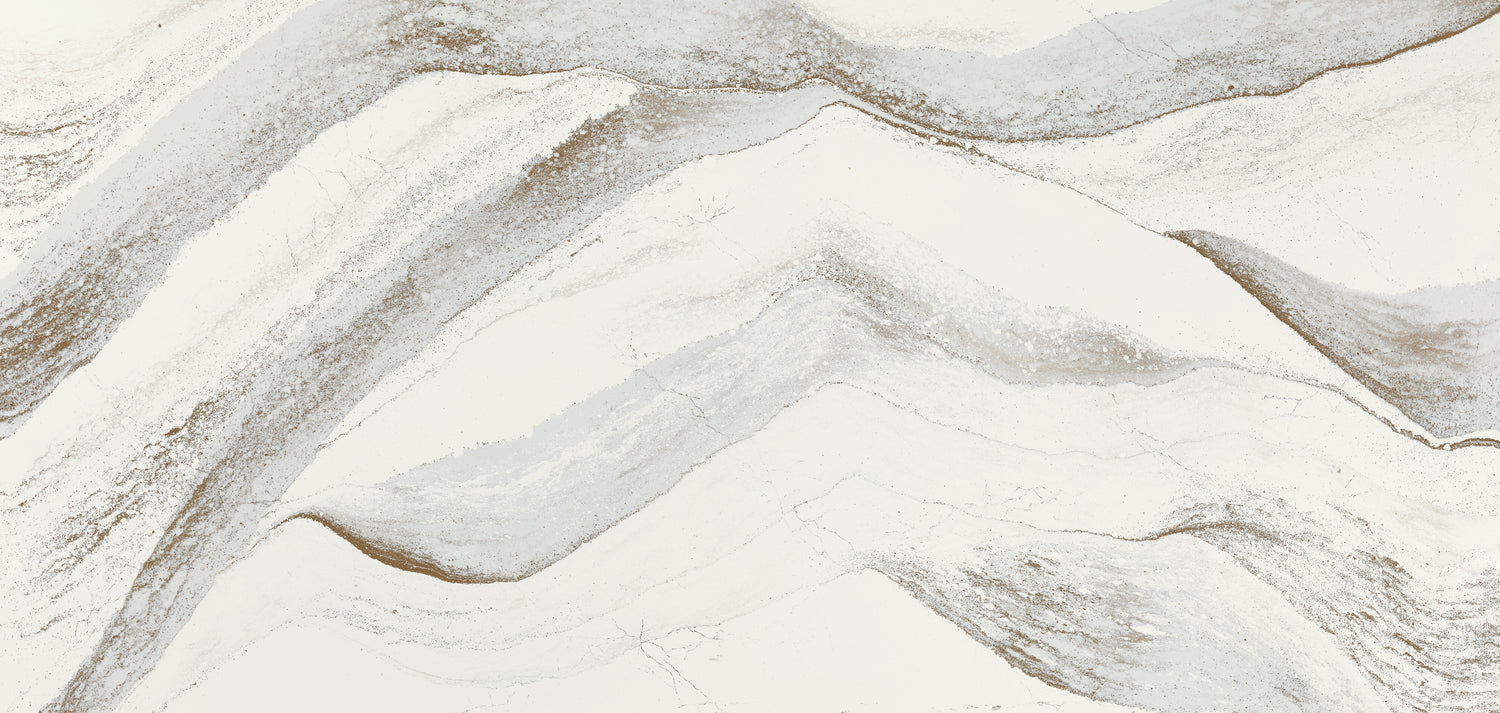 Chocolate brown streams converge along a cool white backdrop, their inviting translucence and momentous movement are punctuated by hints of brilliant brass. The alloy accent lightly traces the peaks and valleys of this flowing umber landscape for visual depth with a glint of glamour.